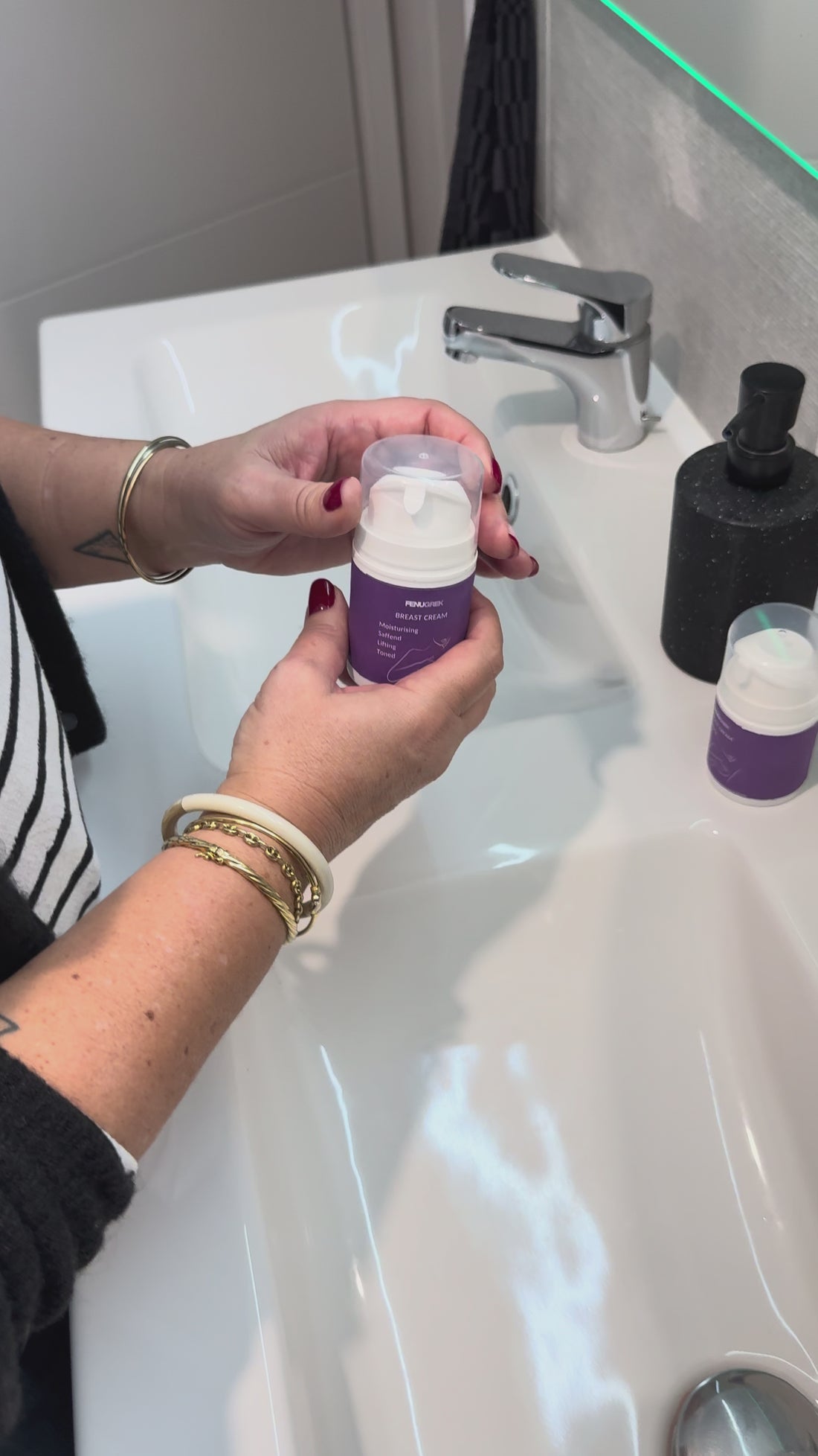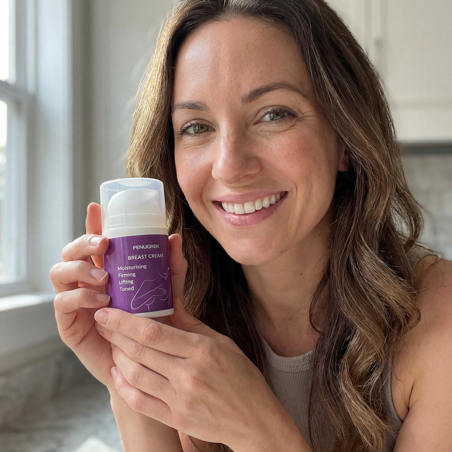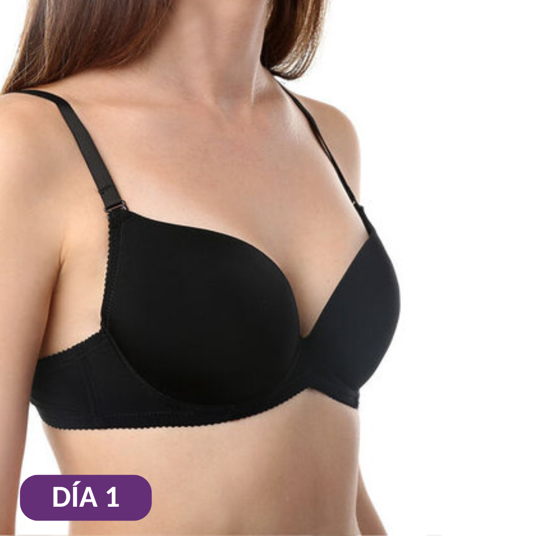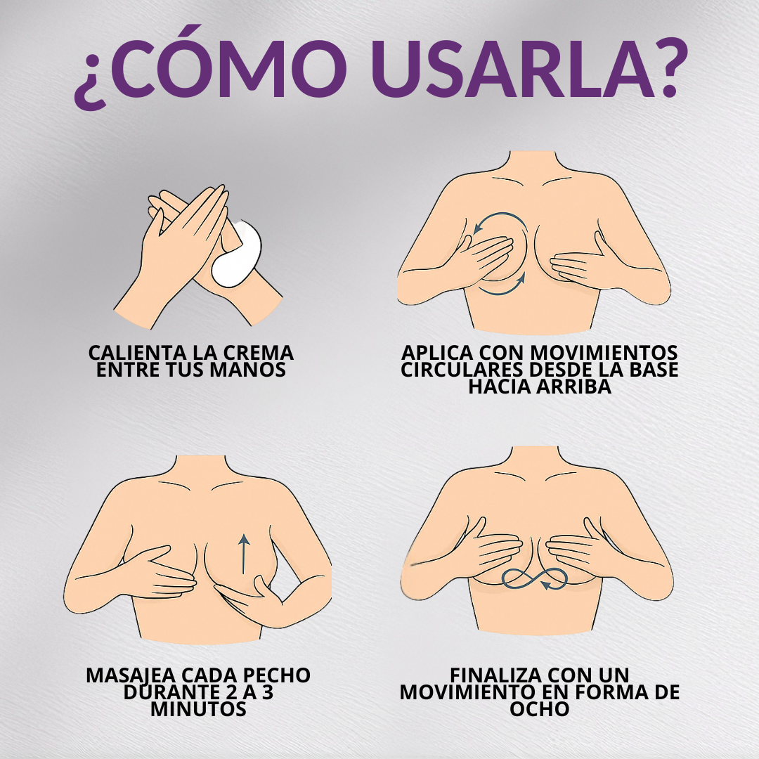 Aplica una pequeña cantidad sobre la piel limpia, luego masajea cada pecho con movimientos circulares y ascendentes durante 2 a 3 minutos.